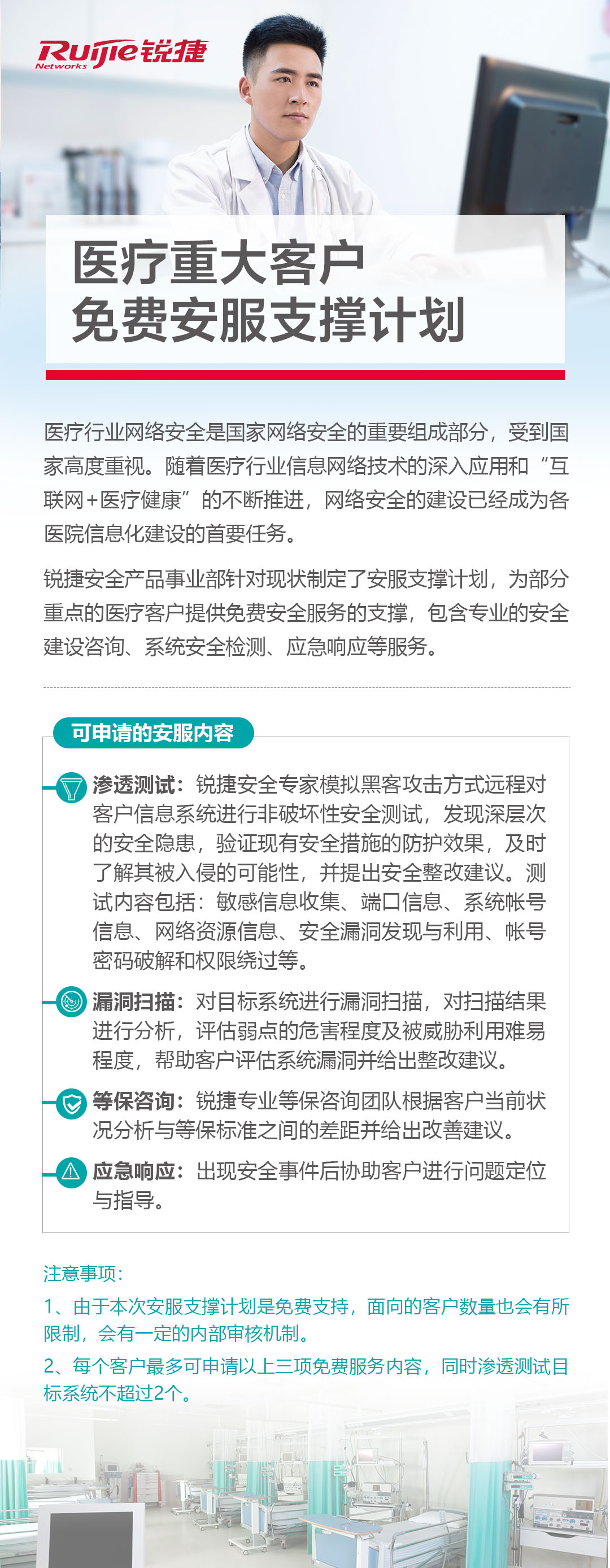 锐捷安全产品事业部针对现状制定了安服支撑计划,为部分重点的医疗客户提供免费安全服务的支撑,包含专业的安全建设咨询、系统安全检测、应急响应等服务。